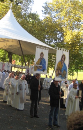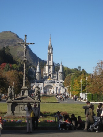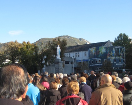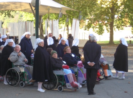 After the tour we found a brasserie for vegetable soup, a ham and cheese baguette and a Heineken beer. 21 euros lighter, we thought we were revived for the afternoon activities. But the beer got the best of us, so napping was our afternoon activity until 4:30 when our group joined the Eucharistic procession of the sick from the hospital across the river from the grotto to the underground church. Mary asked Bernadette for processions, so we obliged.