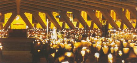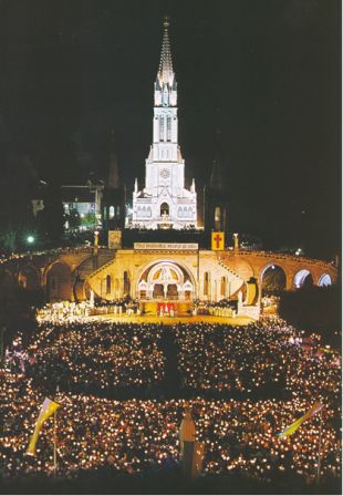Thousands of pilgrims were caught up in the moment. The sick in wheel chairs and stretchers led off the procession followed by the crowds and the priests with the monstrance. Praying and singing for about a half mile we reached the altar of the dark, underground church. When the Eucharist arrived, we sang songs in various languages and adored the Eucharist. Then a priest gave groups of the sick a blessing, and a final blessing for the entire assembly.