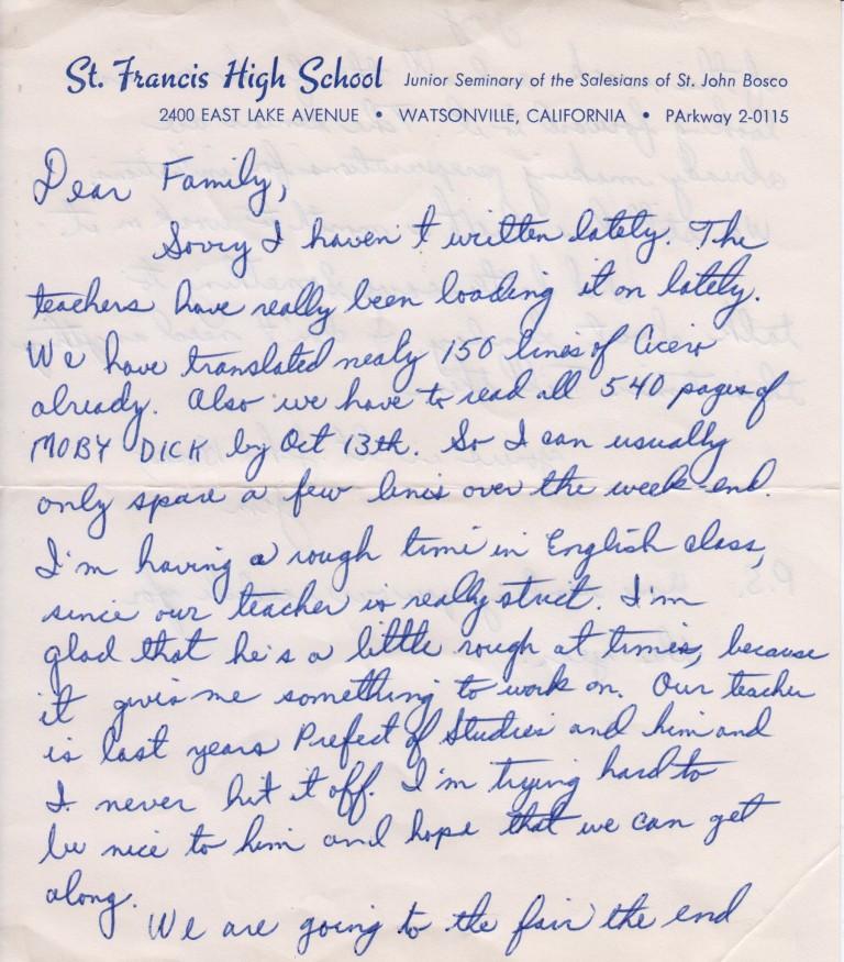 October 1961. Initiations for freshman were a rite of passage that would put you in jail nowadays for hazing. It was a longstanding tradition in the culture of those times. I had students write embellished accounts when I returned to St. Francis as a teaching Brother. The stories were close to experiences in Richmond and Watsonville when I was a student.
