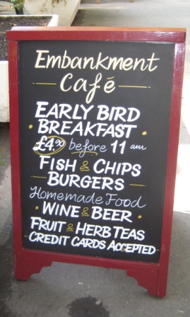 Once again, with a certain trepidation, we boarded the Tube headed for a walking tour of the National Gallery. Yesterday’s rain had given way to crisp fall air and clear blue skies. We were elated as we exited the Tube with no further trauma. I had found a walking tour on the Internet which was supposed to meet near the Tube exit. We asked policemen, tourists, and Londoners about the tour group but to no avail. Since the museum wouldn’t open for a while, we had time for an “American” breakfast at the Embankment café: bacon (ham), eggs (watery scrambled eggs), hash browns (triangular pieces), toast (white Wonder bread), butter and jam.