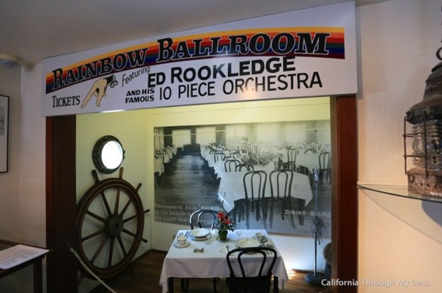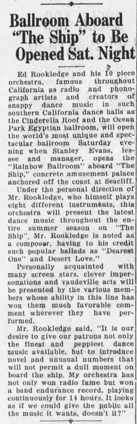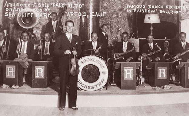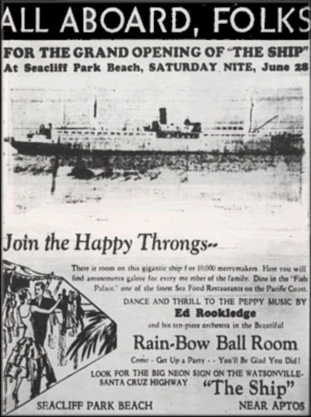 The Seacliff Amusement Corporation borrowed $28,000 to build out the rest of the pier, dig a 190-foot well for fresh water, and pave the access road down from the Watsonville-Santa Cruz Road (today’s Soquel Drive) and along the beach. The pier, measuring 630 feet long and 40 feet wide, was finished in early June 1930. On June 21, the ship’s dancehall, The Rainbow Ballroom, was opened up for a special preview event. The dancehall occupied most of the main deck and was 54-feet wide, with tall windows looking out over the Bay. Several hundred people showed up that night and danced the night away with Ed Rookledge’s 10-Piece Orchestra providing the music.