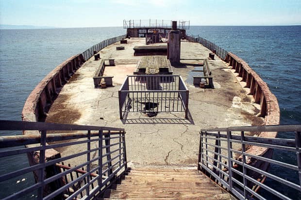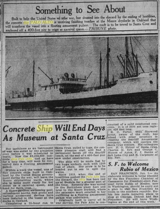 Having failed to see service in the war, the Palo Alto languished in the U.S. Navy Shipyard in Oakland for more than a decade until the Seacliff Amusement Corp. bought the ship in 1929. After installing a dance floor, swimming pool, restaurant, refreshment booths, and other attractions, the corporation had it towed in 1930 from Oakland to Seacliff Beach where it was scuttled on the seafloor with its prow headed out to sea to split the waves.. There it would be connected to a pier leading to the beach and an access road.
