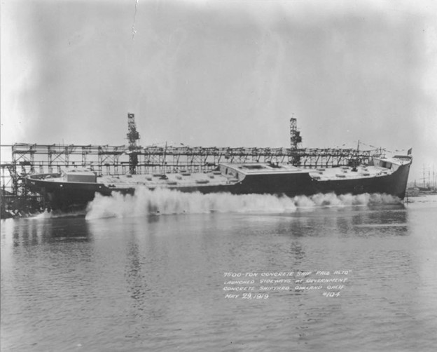 Built in 1918 as an oil tanker designed to refuel other war craft at sea during World War I, the SS Palo Alto, along with her sister ship the SS Peralta, were launched in May 1919 only months before the war ended. Measuring in at 435 feet, she cost an estimated $1.5 million to build with a 2,800 horsepower steam engine, bronze fittings, an eleven ton bronze propeller fifteen feet in diameter, a fifteen-ton rudder, decks of white Norwegian ash, and a tile-floored gallery. Due to her size, she had to be launched sideways. So at 2:15pm, on May 29, 1919, Mrs. Anna May Wig shattered a bottle of champagne against her bow, and the Palo Alto slid to starboard down the wooden ways into the water creating a sizable wave in the harbor!