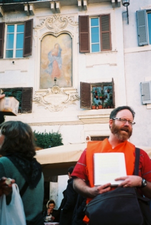 It only got better as we made the Scavi Tour to the remains of St. Peter deep below St. Peter’s. It was another call to prayer to thank St. Peter for all he did to establish our Church and to pray for his intercession for our Church today. Later in the day we visited the grave of St. Catherine of Siena who was so courageous in bringing the papacy back to Rome. If we think the Church is having tough times now, we only need to read about the times of St. Catherine to see how terrible was the condition of the Church in her day. It was on this day too that Brian stopped our group’s parade down a narrow street to pray a Hail Mary near a fresco of Mary on the wall of an adjacent building: