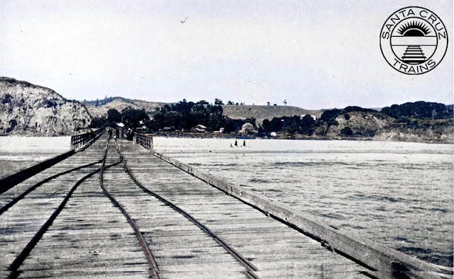 Aptos Wharf and Aptos c. 1882. Taken during the Spreckels era looking north, this rare photo shows the sandstone bluff that is part of today's Seacliff State Beach. The treeless hills in the distance are what we now call Aptos Village, while the buildings to the fight of the wharf are part of Spreckel's Hotel complex. The railroad tracks on the wharf were used to move cargo on small horse-drawn railcars. No locomotives ever came out on the wharf.