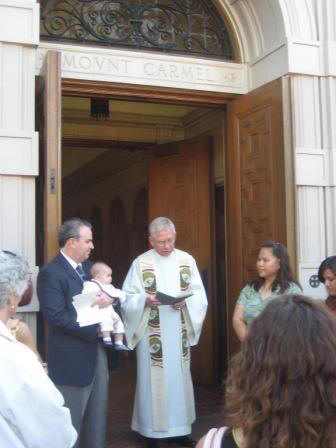 Father welcomes Taryn and her family into the Carmelite monastery for the Baptism