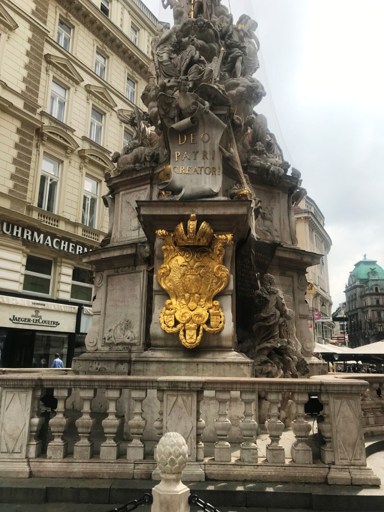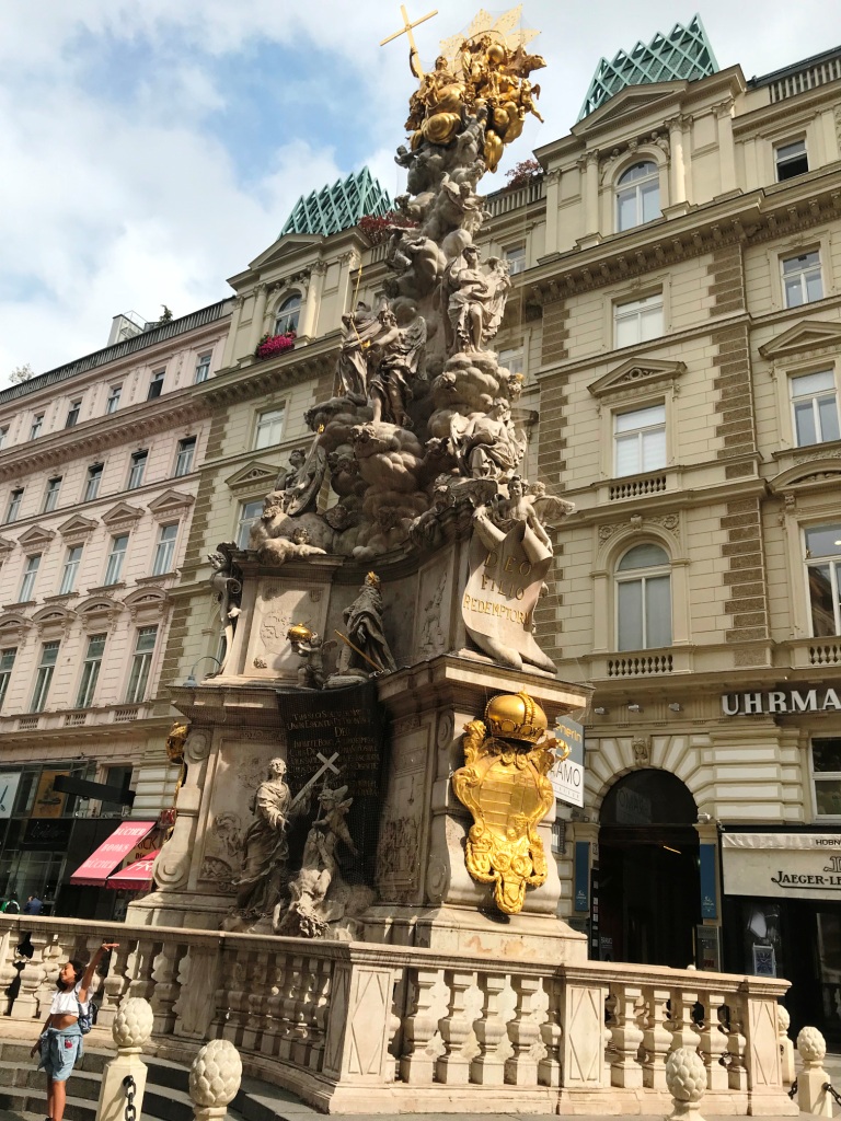 Now our guide led us into a plaza and shopping area. It was amazing to see a monument to the Trinity in the plaza buzzing with locals and tourists: