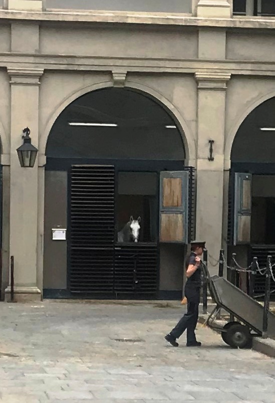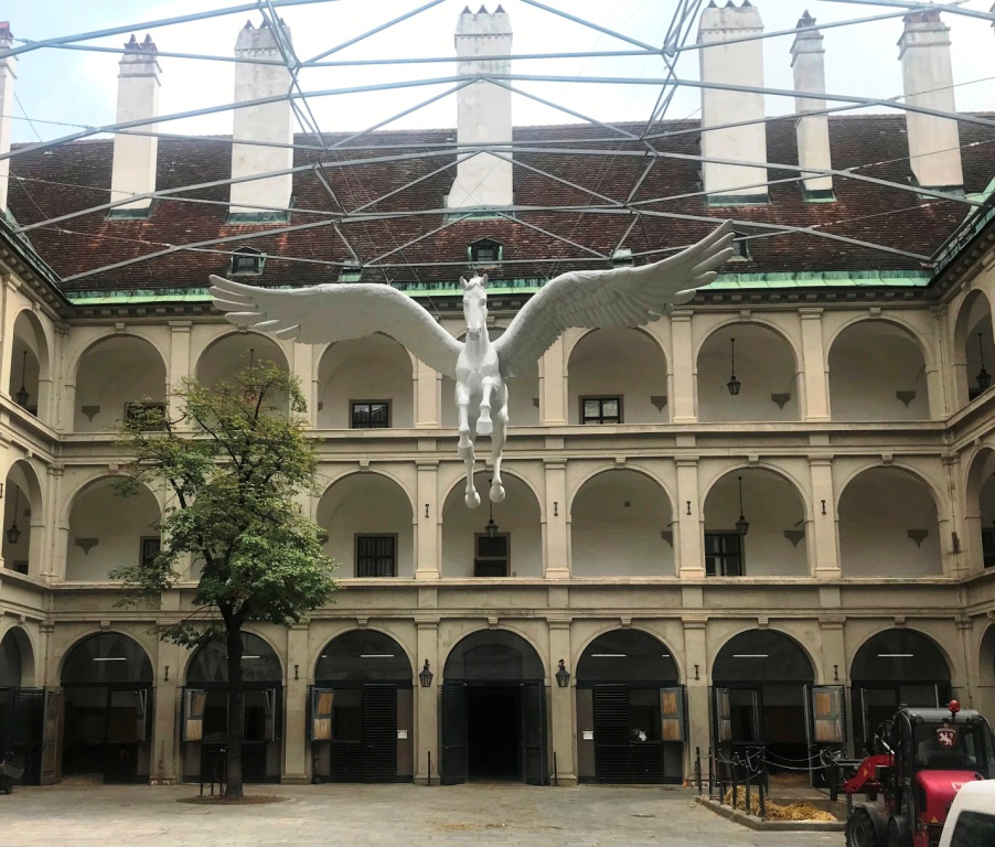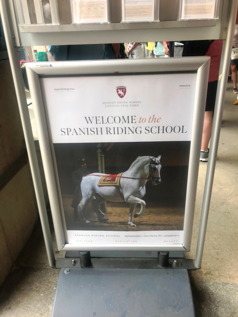 Once past the shopping district, our guide took us by the Spanish Riding School, home of the famous Lipizzaners and their riders. I snapped a picture of the training area and one of the Lipizzaners in its stall.