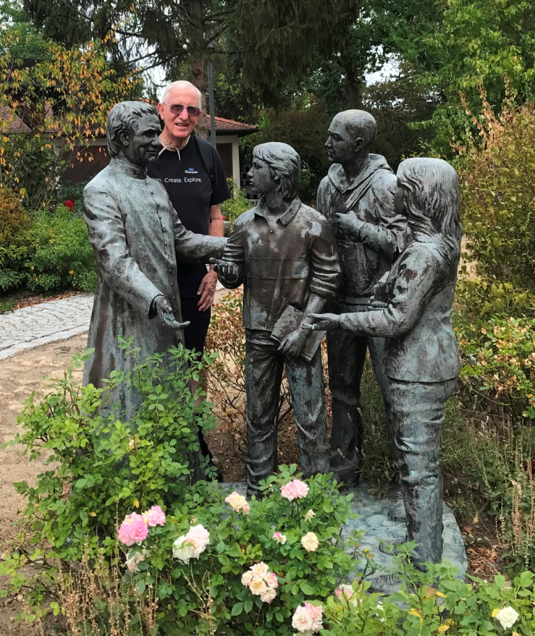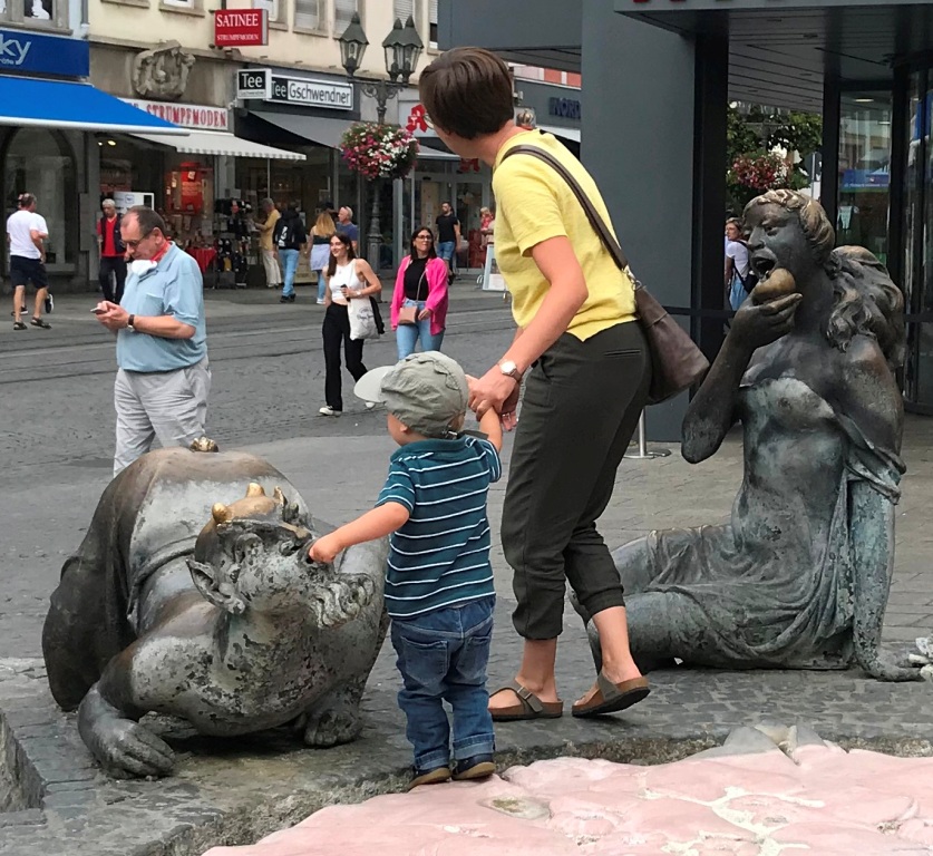 We searched for a refrigerator magnet commemorating our time in Wurzburg. Six euros later, we found a good one then sought a place to sit down by a nearby dry fountain. Barbara clicked a picture of a boy playing with some bronze statues. One was the serpent, Satan; the other a naked Eve biting the apple.