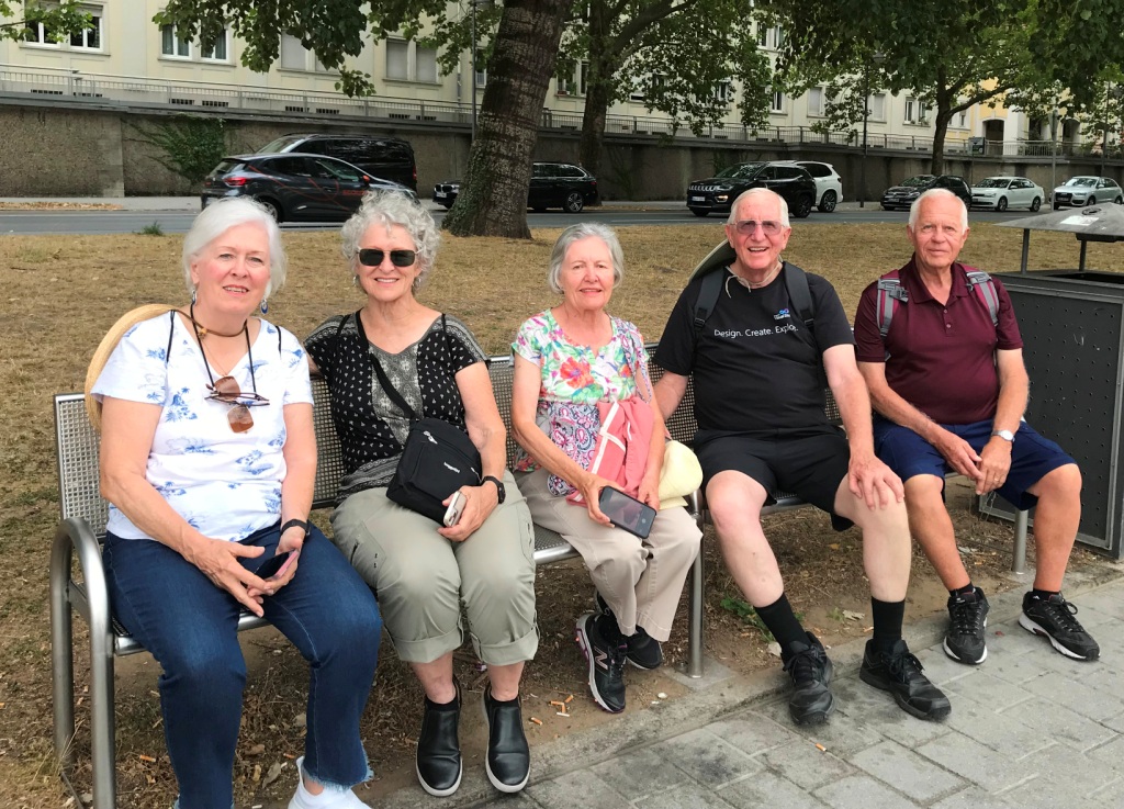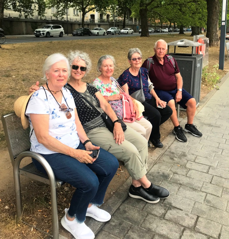 Soon we had to return to the Viking ship. We recognized fellow passengers by the earphones and listening devices issued to those on tour, so we followed the group to be close to the leader. He didn't recognize us and asked if we belonged. I showed him our tickets to the excursion that we had skipped which happened to be his group. Now we could follow him and hear his narration. We tipped him as the tour ended. Coincidentally, we ran into Lana, Judy, Bev, and Bill returning from their shopping and decided to sit on a bench for a short rest: