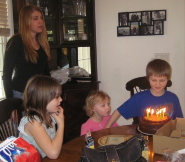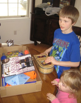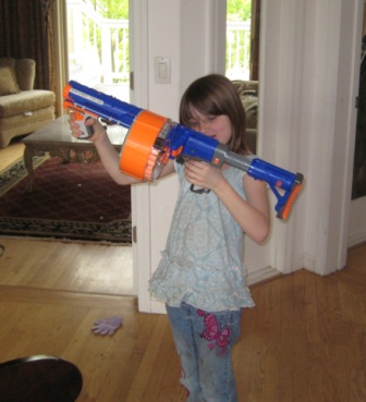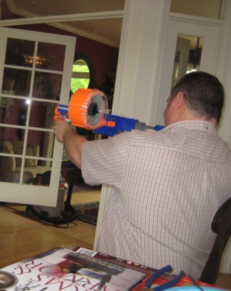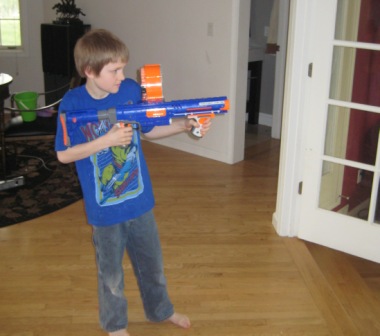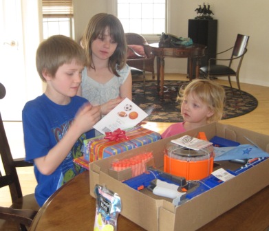 Blowing out candles and reading cards were a good start, but the real fun began with presents: A Roman soldier with armor and an Eyewitness book followed by the perfect gift, a Nerf machine gun.