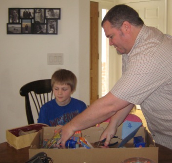 Everyone got into the action. Dad clipped all the wires to release the machine gun from the box. Wyatt and Dad loaded all the Nerf bullets, then Wyatt fired off the first round.